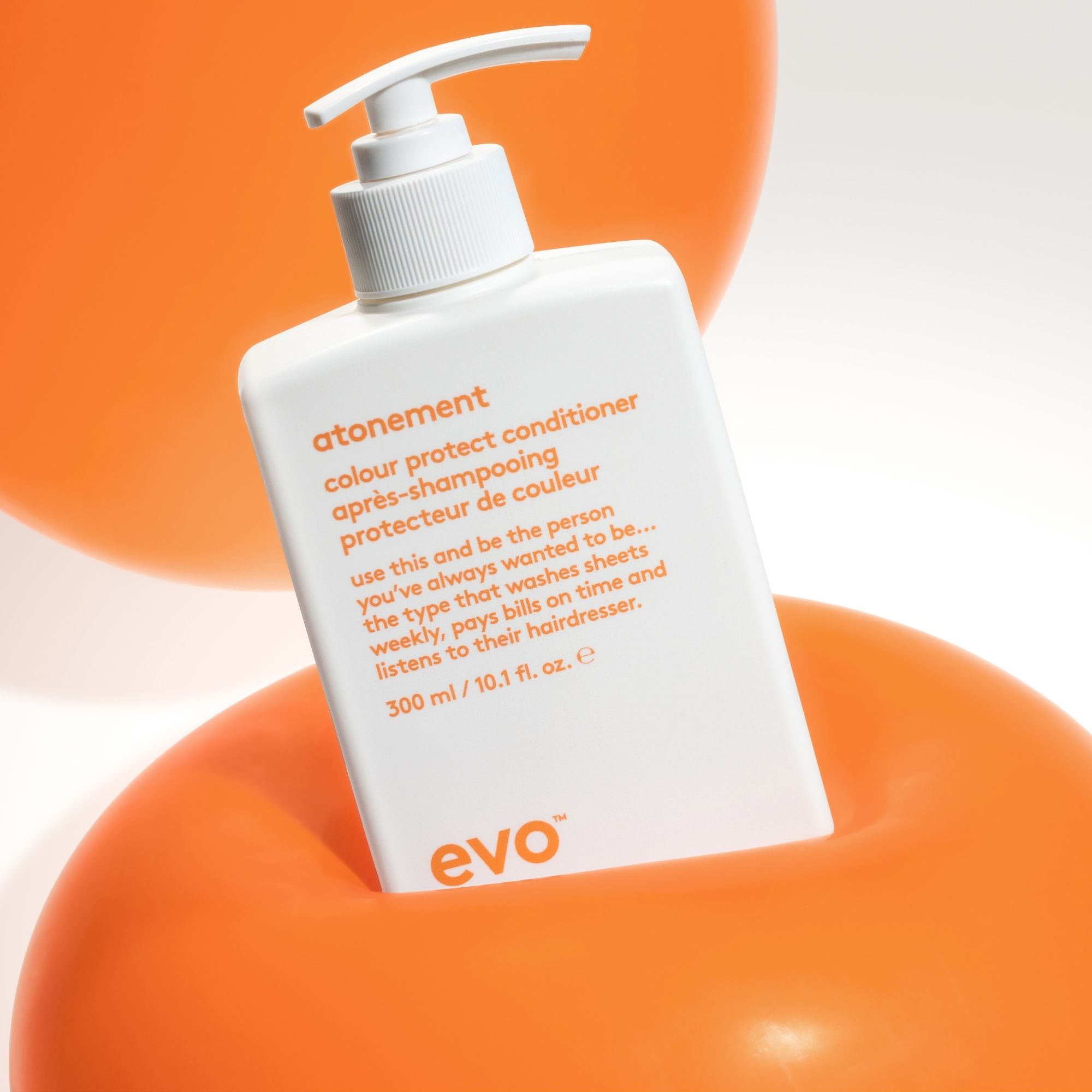 atonement colour protect conditioner features an acidic ph and mineral blocking actives to ensure hair colour stays vibrant, while cationic conditioners seal the cuticle to improve hair's manageability and shine. sunflower seed oil, vitamin e and uv filters guard the hair against colour fade caused by environmental factors while hydrolyzed quinoa reduces porosity, protects against breakage, and improves colour retention. glycerine and shea butter improve hydration, slip and shine. atonement colour protect conditioner is part of the evo colour protect family, designed to lock in vibrancy, protect against colour fade and keep hair healthy and strong.