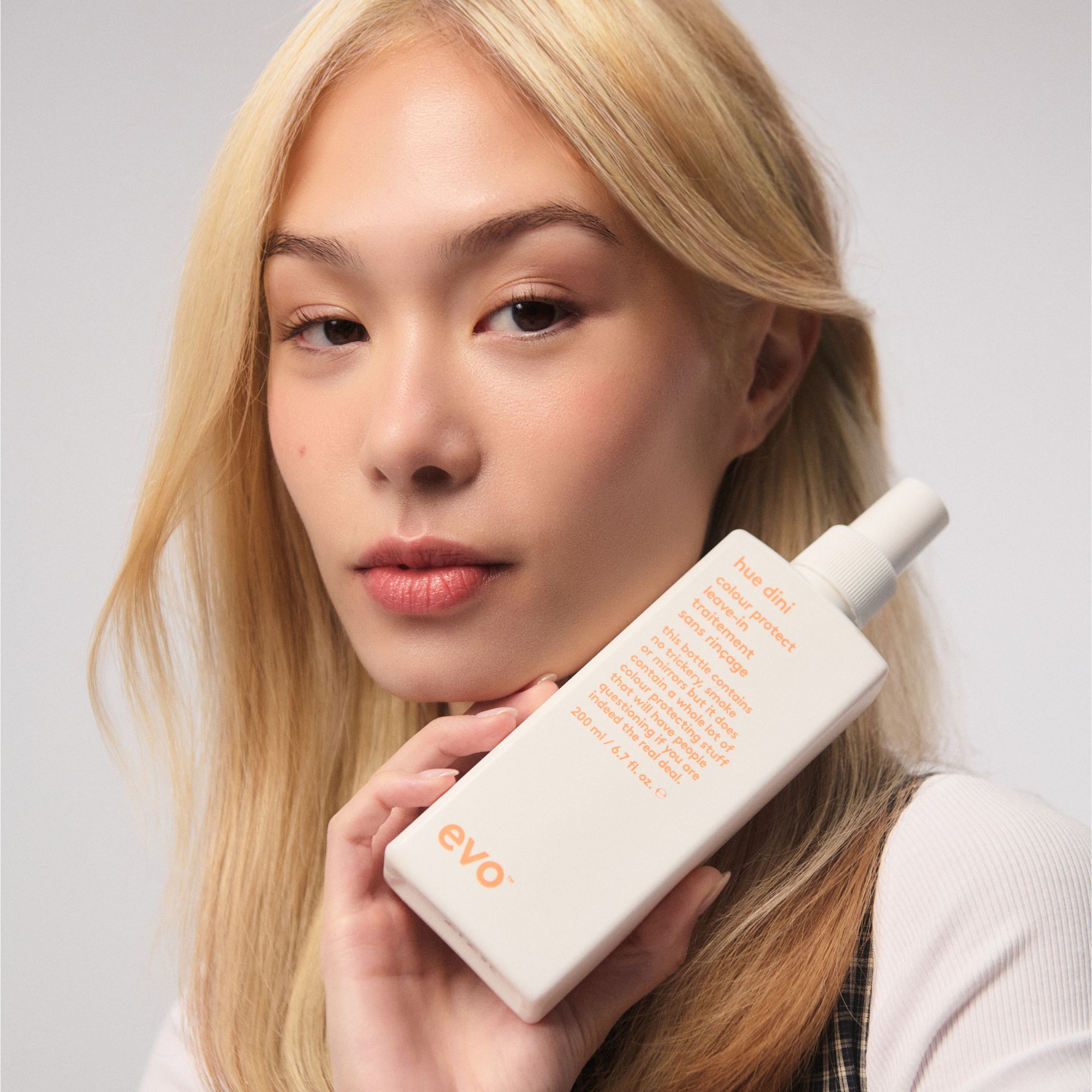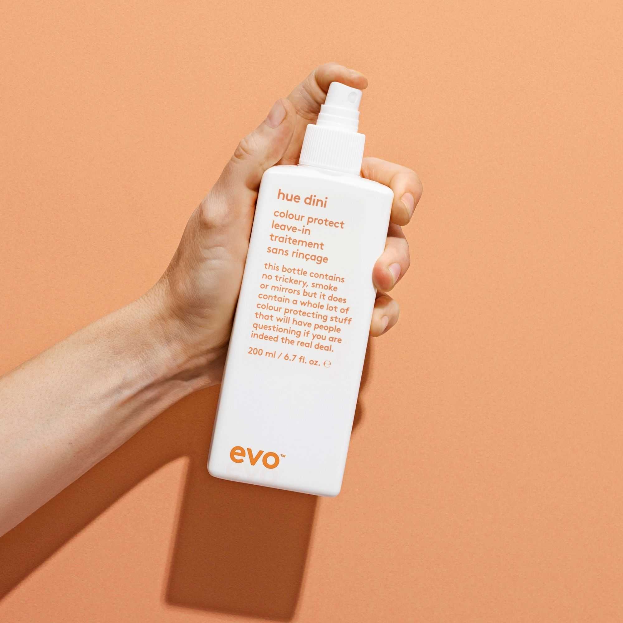 hue dini colour protect leave-in creates a lightweight shield that locks in colour, strengthens hair and smooths the cuticle. the acidic, protein-rich formula locks in pigment and preserves vibrancy to keep your colour looking better for longer. jojoba and panthenol provide ultra-lightweight conditioning and shine, while sunflower seed oil, vitamin e and uv filters guard the hair against colour fade caused by the sun, heat styling, and other environmental factors. hydrolyzed quinoa and jojoba seal the hair's cuticle to protect against breakage and improve colour retention. hue dini colour protect leave-in is part of the evo colour protect family, designed to lock in vibrancy, protect against colour fade and keep hair healthy and strong.