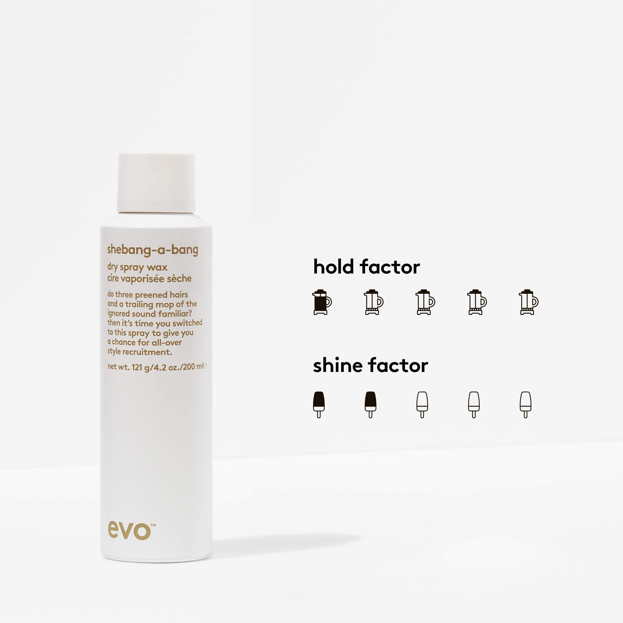 shebang-a-bang dry spray wax is a versatile hair styling spray that can be applied to damp or dry hair to create volume, texture and aid style support. this spray wax contains moisturising properties to enhance combability and add shine. shebang-a-bang can be layered with day of grace pre-style primer to achieve a smoother finish when blow-drying. this dry spray wax is part of the style family offering styling and finishing options for all hair types.