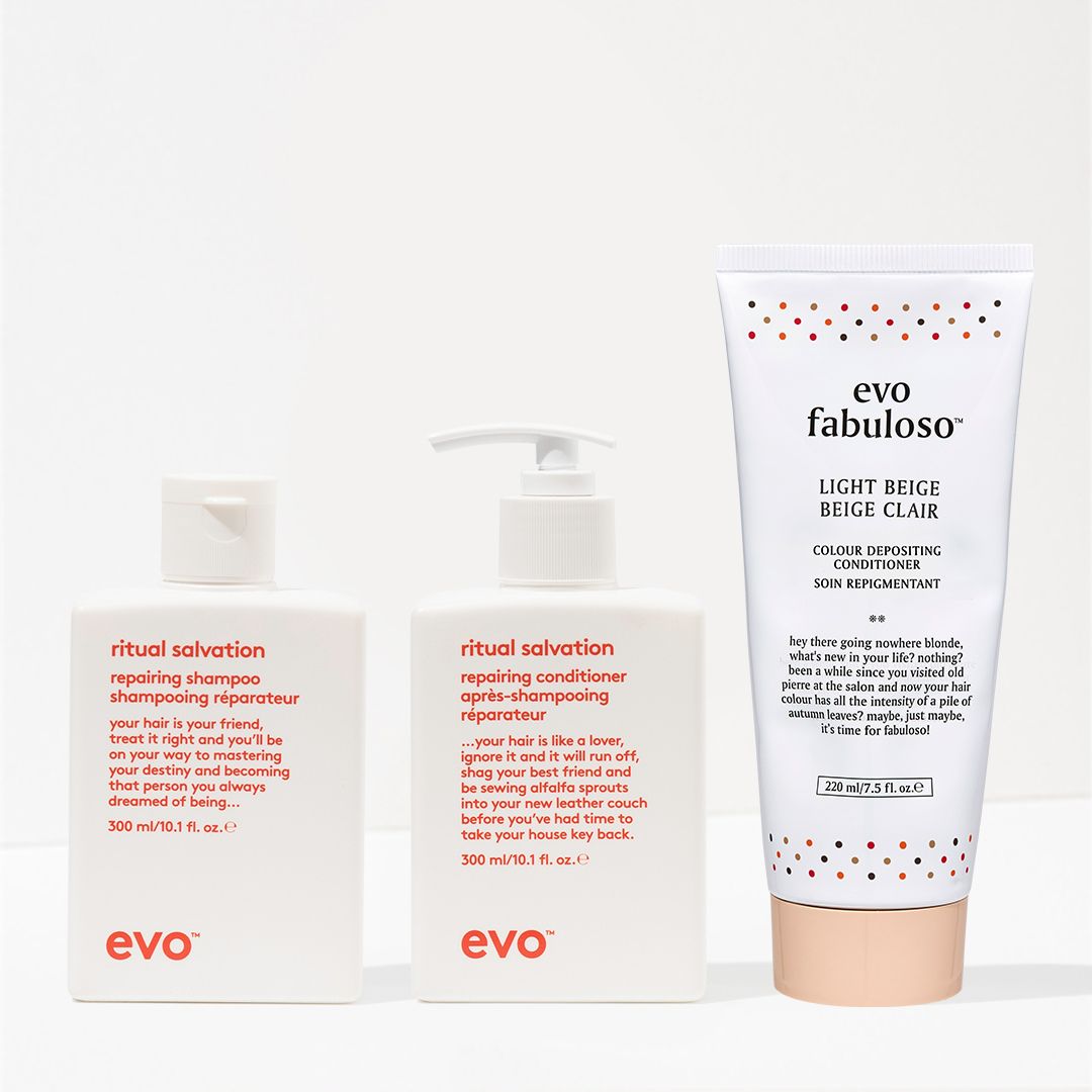 if you're ready to upgrade your color maintenance routine, grab this protein-rich shampoo, conditioner and light beige colour depositing conditioner trio to cleanse, repair and strengthen, while refreshing and reviving color-treated hair.