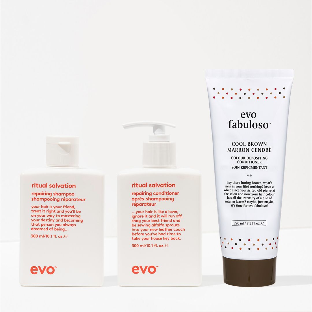 if you're ready to upgrade your color maintenance routine, grab this protein-rich shampoo, conditioner and cool brown colour depositing conditioner trio to cleanse, repair and strengthen, while refreshing and reviving color-treated hair.