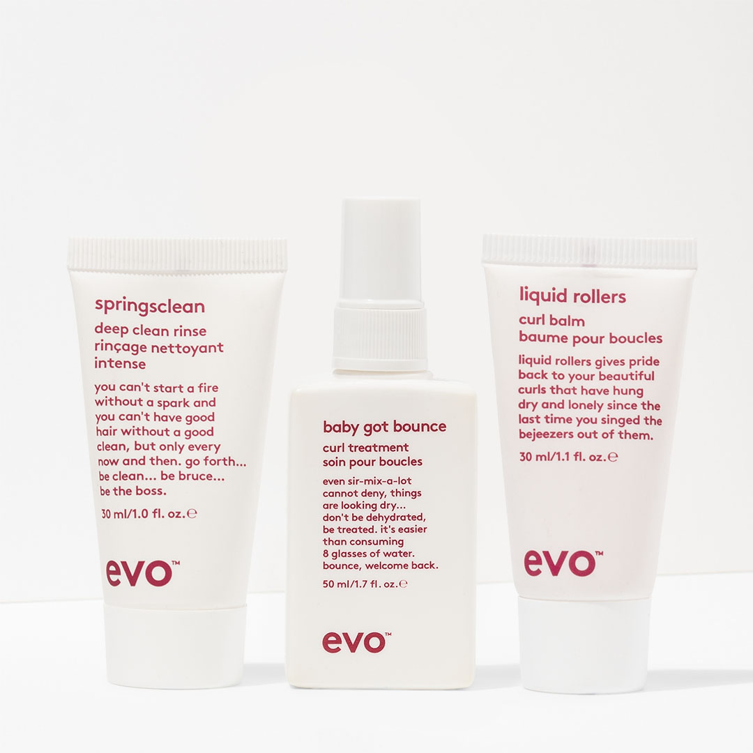 springsclean: aqua, peg-12 dimethicone, xanthan gum, parfum, coco-glucoside, phenoxyethanol, cocamidopropyl betaine, polyquaternium-10, hydrolyzed quinoa, benzoic acid, persea gratissima (avocado) oil, simmondsia chinensis (jojoba) seed oil, dehydroacetic acid, butylene glycol, ethylhexylglycerin, sodium acetate, sodium chloride, isopropyl alcohol, potassium sorbate, coumarin. baby got bounce: aqua, isopropyl myristate, cetearyl alcohol, glycerin, behentrimonium chloride, argania spinosa kernel oil, behentrimonium methosulfate, amodimethicone, parfum, butyrospermum parkii (shea butter), glyceryl stearate, theobroma cacao seed butter, phenoxyethanol, isopropyl alcohol, cetrimonium chloride, simmondsia chinensis (jojoba) seed oil, theobroma grandiflorum seed butter,trideceth-15, trideceth-3, benzoic acid, dehydroacetic acid, vp/dmapa acrylates copolymer, hydrolyzed quinoa, alcohol, butylene glycol, acetic acid, ethylhexylglycerin, benzalkonium chloride,potassium sorbate, coumarin. liquid rollers: aqua, cetyl alcohol, cetearyl alcohol, behentrimonium chloride,pvp, isopropyl myristate, stearamidopropyl dimethylamine, cyclomethicone, cyclopentasiloxane, peg-20 stearate, phenoxyethanol, methyl gluceth-20, parfum, isoproyl alcohol, phenyl trimethicone, dimethiconol, polyquaternium-28, citric acid, panthenol, benzoic acid, hydrolyzed quinoa, dehydroacetic acid, butylene glycol, ethylhexylglycerin, potassium sorbate, amyl cinnamal, linalool, benzyl salicylate, citronellol, geraniol, limonene