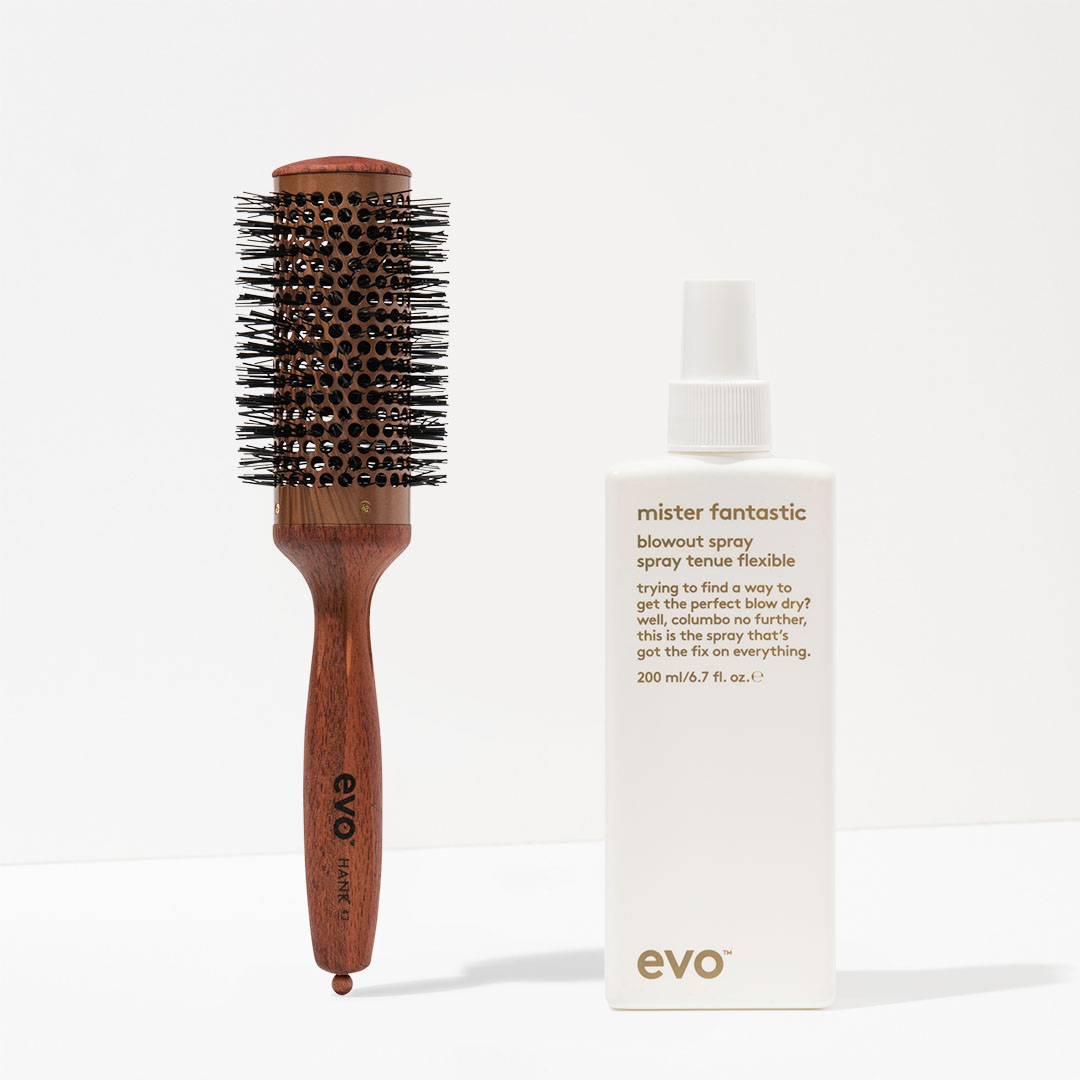 a ceramic bristle radial brush and blowout spray for a blow-dry with extra volume at the roots, minus any damage.
