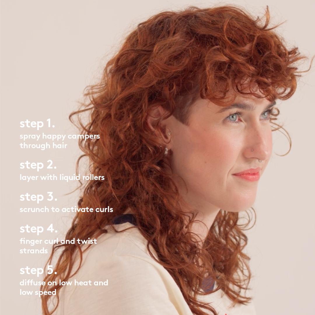 apply a blend of happy campers and liquid rollers to wet curls, and diffuse to leave every curl defined, soft and exuding 'health'.