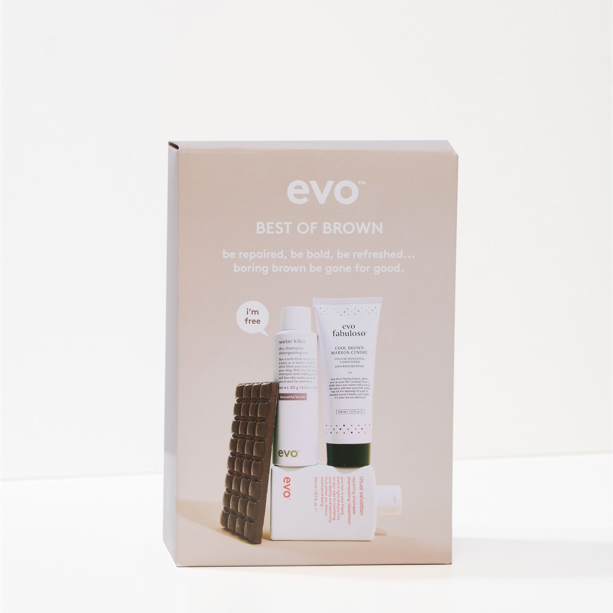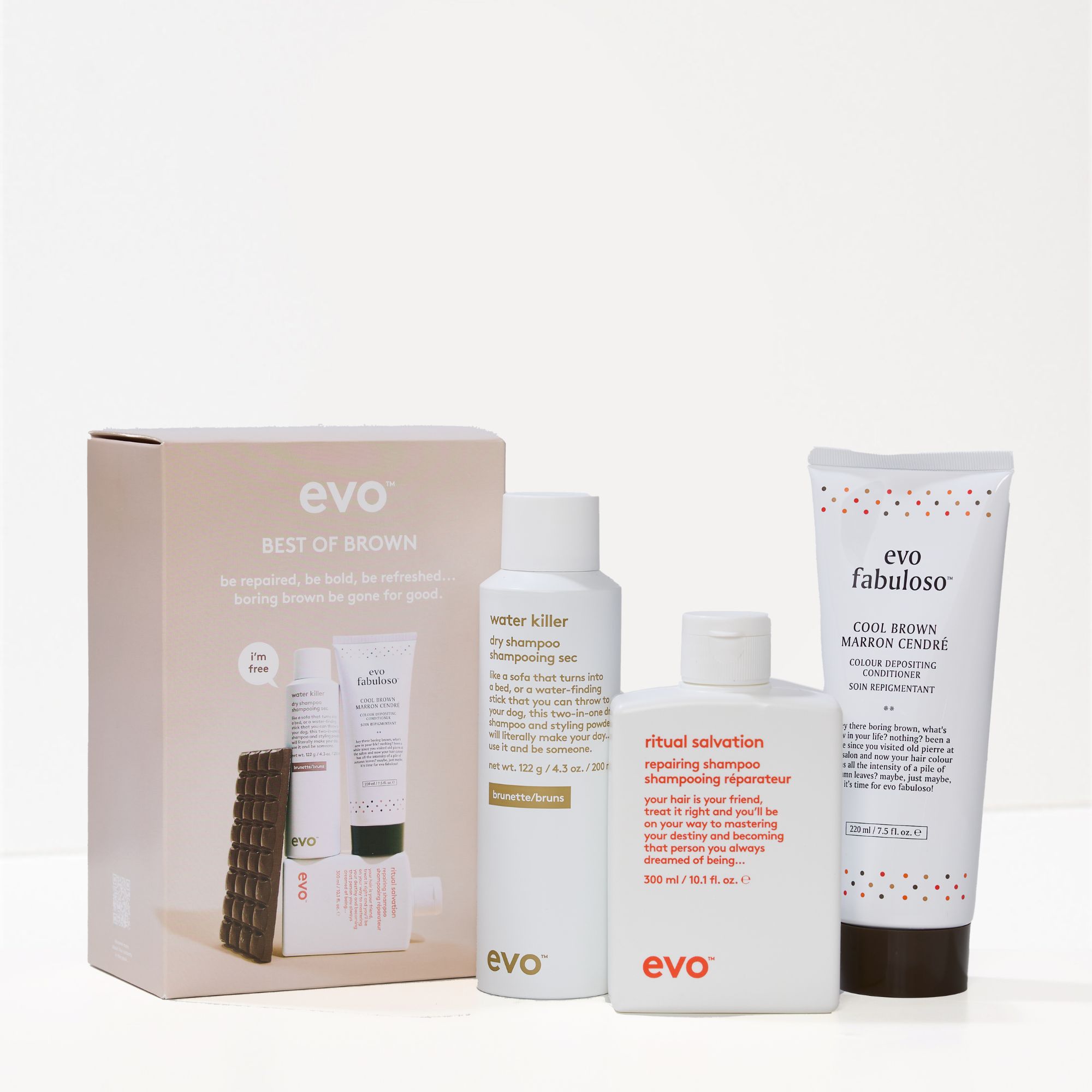 be repaired, be bold, be refreshed… boring brown be gone for good. the best of brown gift set contains a ritual salvation repairing shampoo, an evo fabuloso cool brown colour depositing conditioner, and a free water killer brunette dry shampoo.